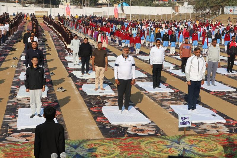 नरसिंहपुर। प्रदेश शासन के पंचायत एवं ग्रामीण विकास व श्रम मंत्री प्रहलाद सिंह पटेल के मुख्य आतिथ्य में स्वामी विवेकानन्द जी की जयंती पर "युवा दिवस" के रूप में सामूहिक सूर्य नमस्कार का कार्यक्रम सोमवार को स्टेडियम ग्राउंड नरसिंहपुर में आयोजित हुआ। जिले के स्कूलों, कॉलेजों सहित अन्य संस्थाओं में भी सामूहिक सूर्य नमस्कार के कार्यक्रम आयोजित हुए। कार्यक्रम का शुभारंभ दीप प्रज्जवलन और स्वामी विवेकानंद जी के चित्र पर माल्यार्पण और राष्ट्रगीत वंदे मातरम् का सामूहिक गायन से किया गया। इस दौरान आकाशवाणी द्वारा सीधे प्रसारित कार्यक्रम के साथ सूर्य नमस्कार की सभी 12 मुद्राओं को क्रमवार किया और प्राणायाम का अभ्यास भी किया गया। सामूहिक सूर्य नमस्कार में प्रार्थना की मुद्रा, हस्त उत्तानासन, पादहस्तासन, अश्व संचालनासन, पर्वतासन, अष्टांग नमस्कार, भुजंगासन, पर्वतासन आदि 12 मुद्राओं का अभ्यास किया और अनुलोम- विलोम, भस्त्रिका एवं भ्रामरी प्राणायाम किया। इस अवसर पर स्वामी विवेकानंद जी के संदेश का प्रसारण किया गया। साथ ही मध्यप्रदेश के मुख्यमंत्री डॉ. मोहन यादव ने आकाशवाणी से अपना संदेश दिया।