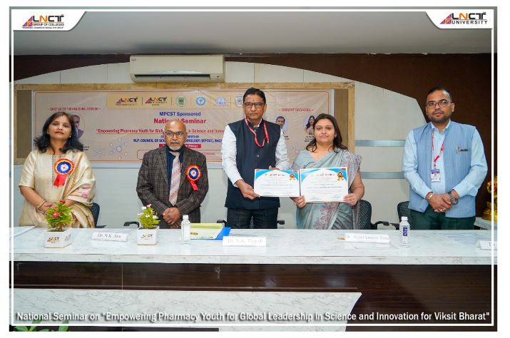 भोपाल। Madhya Pradesh Council of Science and Technology (MPCST) द्वारा प्रायोजित राष्ट्रीय संगोष्ठी का आयोजन LNCT University, भोपाल के स्कूल ऑफ फार्मेसी एवं स्कूल ऑफ फार्मास्युटिकल साइंसेज़ द्वारा को किया गया। संगोष्ठी का शुभारंभ डॉ एन के जैन पूर्व प्रोफेसर, Dr. H. S. Gour University, सागर के मुख्य आतिथ्य में हुआ। डॉ. जैन ने मुख्य वक्ता के रूप में ड्रग डिलीवरी रिसर्च विषय पर एक उपयोगी एवं ज्ञानवर्धक व्याख्यान प्रस्तुत किया। कार्यक्रम में अन्य वक्ताओं के रूप में Dr. Keerti Jain, National Institute of Pharmaceutical Education and Research Raebareli से तथा Mahendra Joshi, Cerebral Lab Private Limited ने भी अपने उत्कृष्ट व्याख्यानों के माध्यम से प्रतिभागियों को महत्वपूर्ण जानकारी प्रदान की। इस अवसर पर फार्मेसी के क्षेत्र में उत्कृष्ट योगदान के लिए डॉ. एन. के. जैन को लाइफ टाइम अचीवमेंट अवार्ड से सम्मानित किया गया। कार्यक्रम में डॉ एन के थापक कुलपति, एलएनसीटी यूनिवर्सिटी विशिष्ट अतिथि के रूप में उपस्थित रहे। कार्यक्रम के संयोजक डॉ ए के सिंघई के साथ ही इस राष्ट्रीय संगोष्ठी में लगभग 300 से अधिक प्रतिभागियों ने भाग लिया।